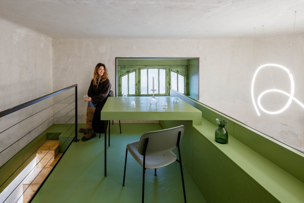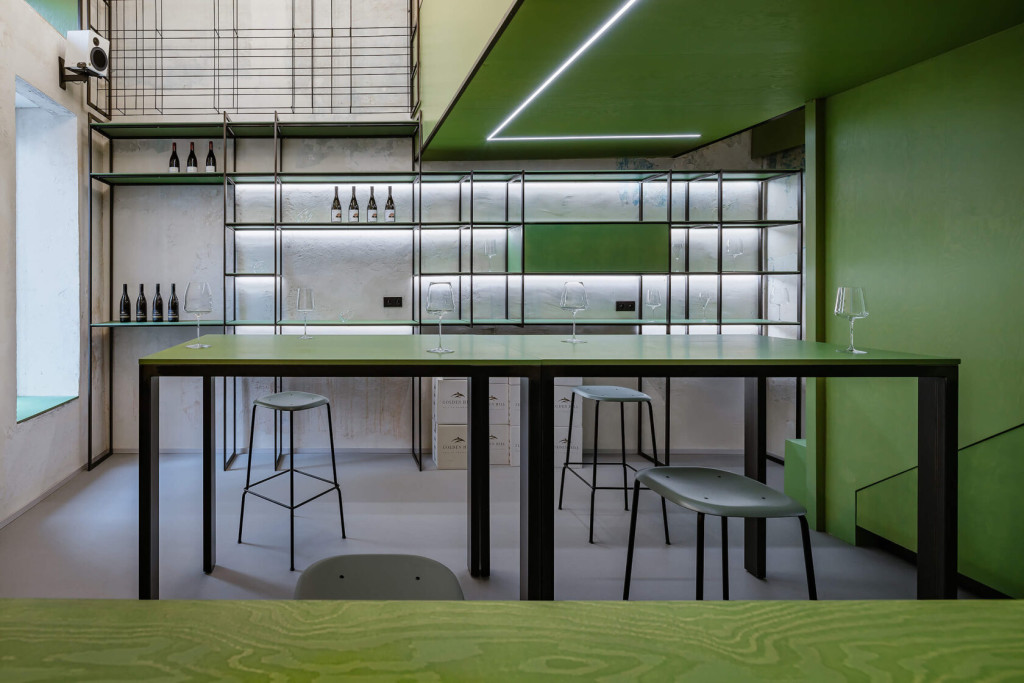 Celý interiér se nese v paletě jemných tónů a přírodních materiálů. Hlavní roli hraje zelená barva, která připomíná vinice i samotné láhve vína, a přirozeně propojuje prostor s krajinou, odkud pochází. Naopak kovové detaily a přiznaná konstrukce přinášejí lehký industriální nádech, aniž by však prostor působil chladně.