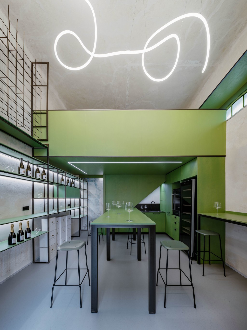 Díky výšce stropu mohl být do dispozice vložen vestavěný blok, který prostor nenásilně dělí. V přízemí se nachází bar a kuchyňka pro každodenní provoz i speciální události, horní úroveň pak slouží jako klidné zázemí pro soukromé degustace.