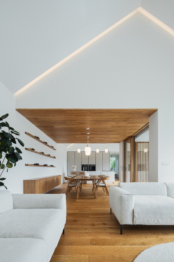 Dům je rozdělen do dvou jednopodlažních částí, které propojuje otevřený krček sloužící zároveň jako přirozené rozhraní mezi obytnou zónou a garáží s kadeřnickým salonem. Hlavní obytný prostor s kuchyní je volný až do krovu, což interiéru dodává vzdušnost a dostatek denního světla. Na něj navazuje jídelní záliv s krytou terasou orientovanou do zahrady. V zadní části domu se nachází klidová zóna se třemi pokoji, koupelnami, šatnou a technickým zázemím. Díky tomuto členění je dům logicky uspořádán, s jasně odděleným soukromým a společenským prostorem.