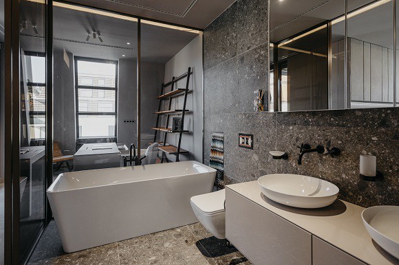 „Barevnost je navržená do velmi aktuálních tónů temné hnědo-černé a šedé doplněné barevnými pastelovými akcenty křišťálových a kožených doplňků. Dominantou obývacího pokoje je na míru vyrobená látková tapeta připomínající soudobý obraz,“ tak představuje ukázkový byt ve svém pojetí Pantelis Larcou.