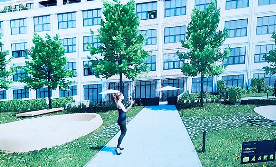 Klient vidí skutečnou velikost budov a bytů, objekty prochází v reálných dispozicích. Zde areál s parkem u projektu Aalto Cibulka